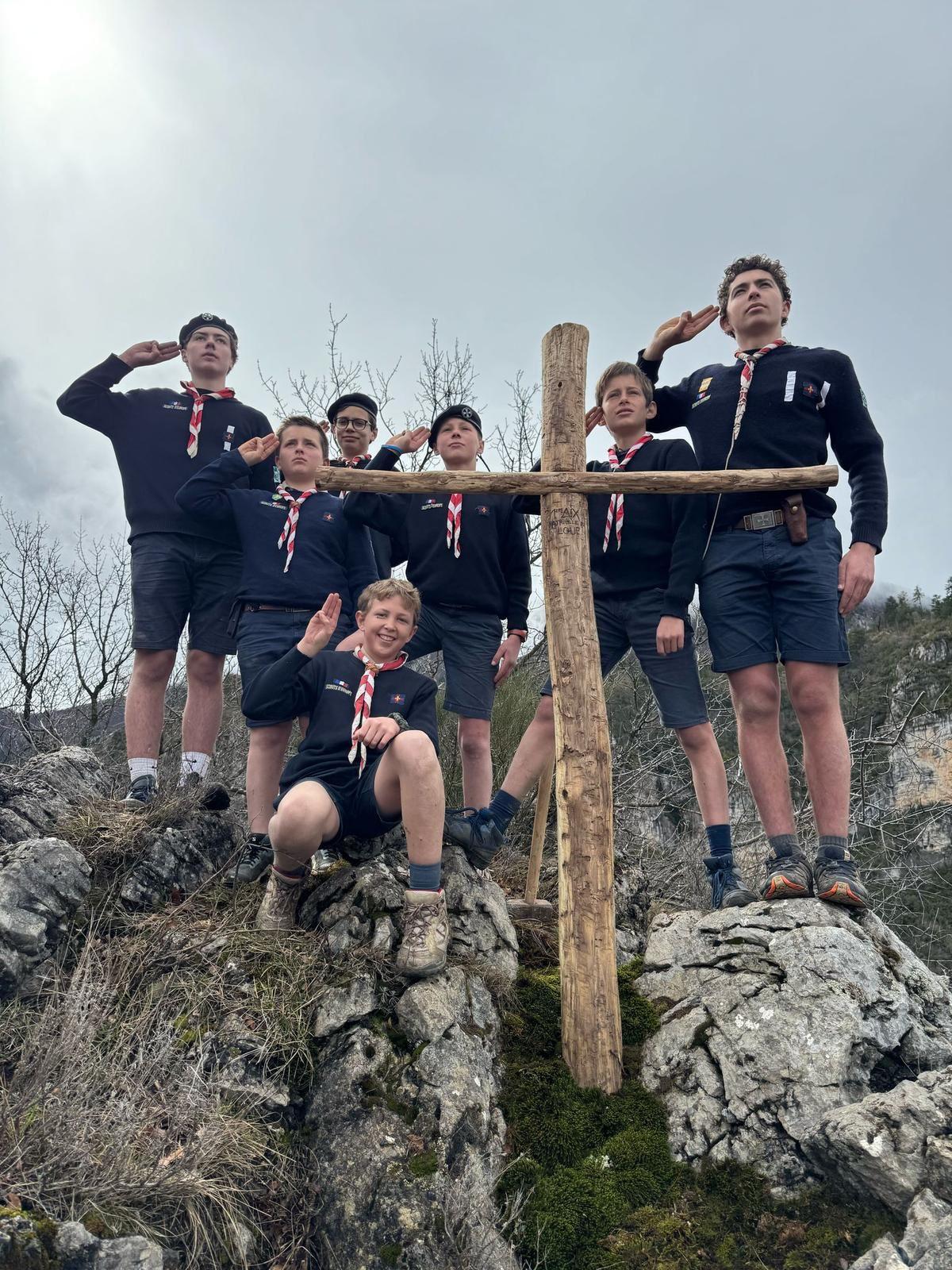 Le week-end du 22 et 23 mars, la patrouille du Loup s’est rendue dans la vallée du Jabron, dans les Alpes de Haute Provence, pour y ériger une croix. Ce projet, préparé depuis plusieurs semaines, s’inscrit pleinement dans notre qualification Cime et notre chemin de progression scoute et spirituelle. Réalisée en bois d’acacia, un bois à la fois dense et résistant, cette croix a été solidement installée au sommet d'un piton rocheux.